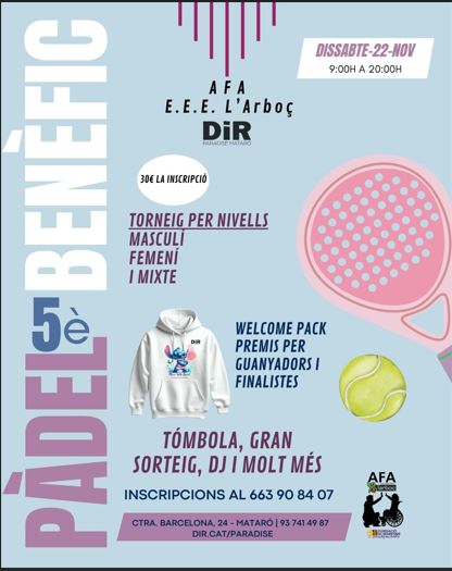 L’Associació de Famílies d’Alumnes (AFA) organitza el 5è Torneig de pàdel solidari en benefici de l’Escola d’Educació Especial l’Arboç. La jornada esportiva tindrà lloc el divendres 22 de novembre al DiR Paradise Mataró, i té com a objectiu fomentar la solidaritat i el vincle amb la comunitat educativa a través de l’esport. No t'ho perdis!